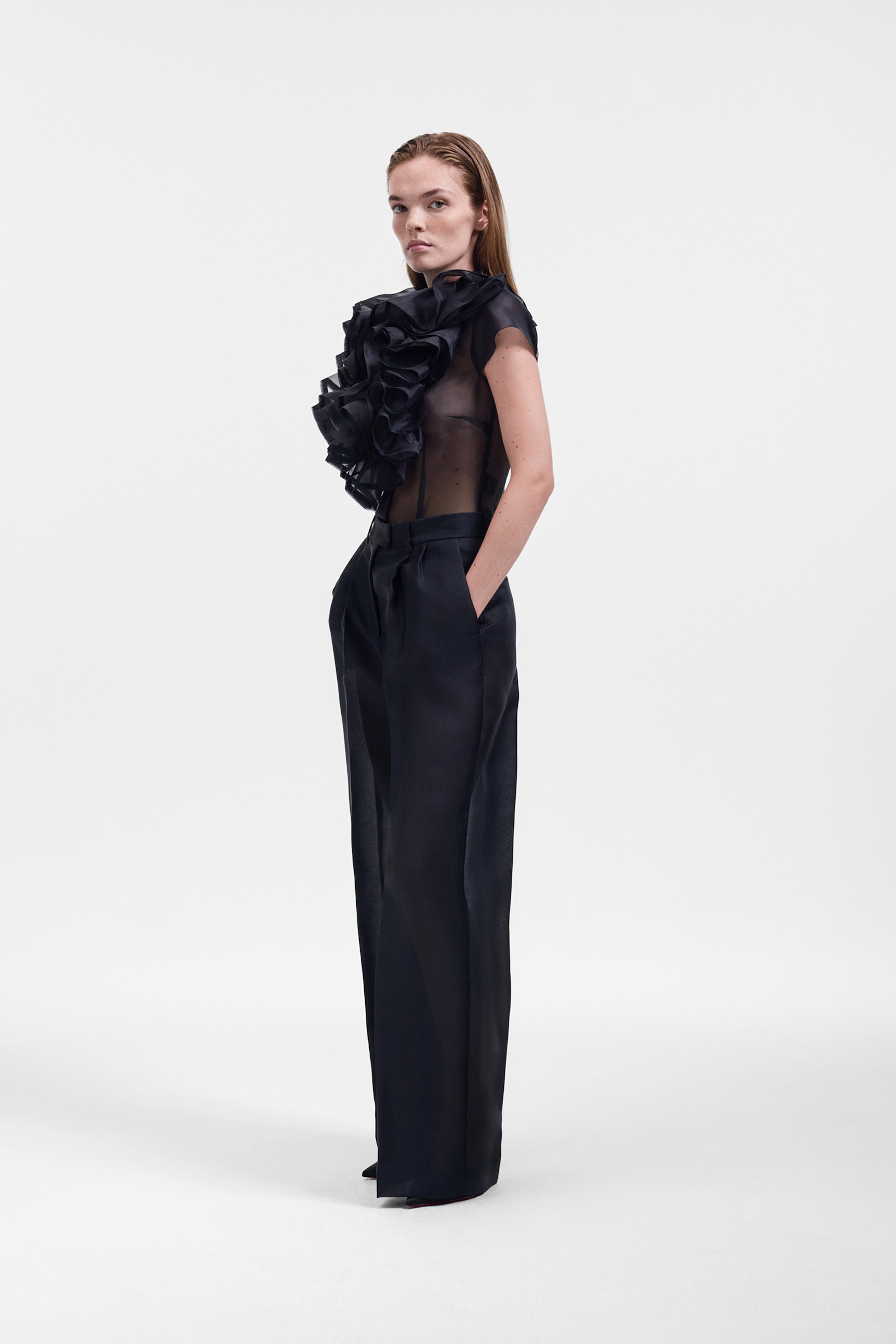 In structured black gazar, these classic straight tailored trousers deliver a sharp, architectural silhouette with modern refinement.