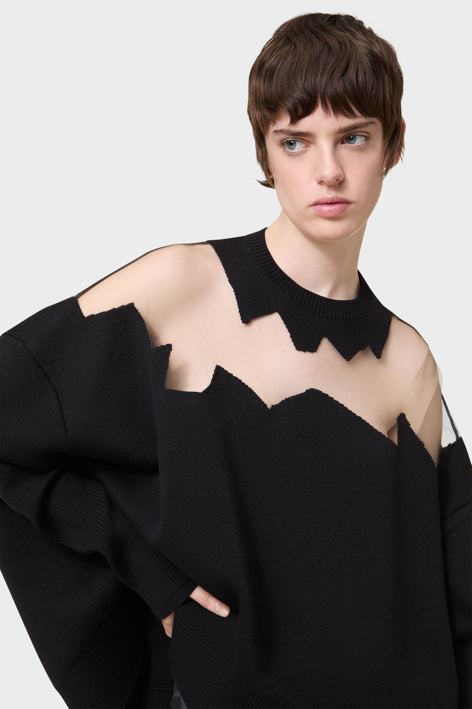 The knitwear, inspired by Viktor&Rolf's Scissorhands, is crafted with 100% merino wool and showcases intricate holes knitted with transparent yarn in a jacquard technique.