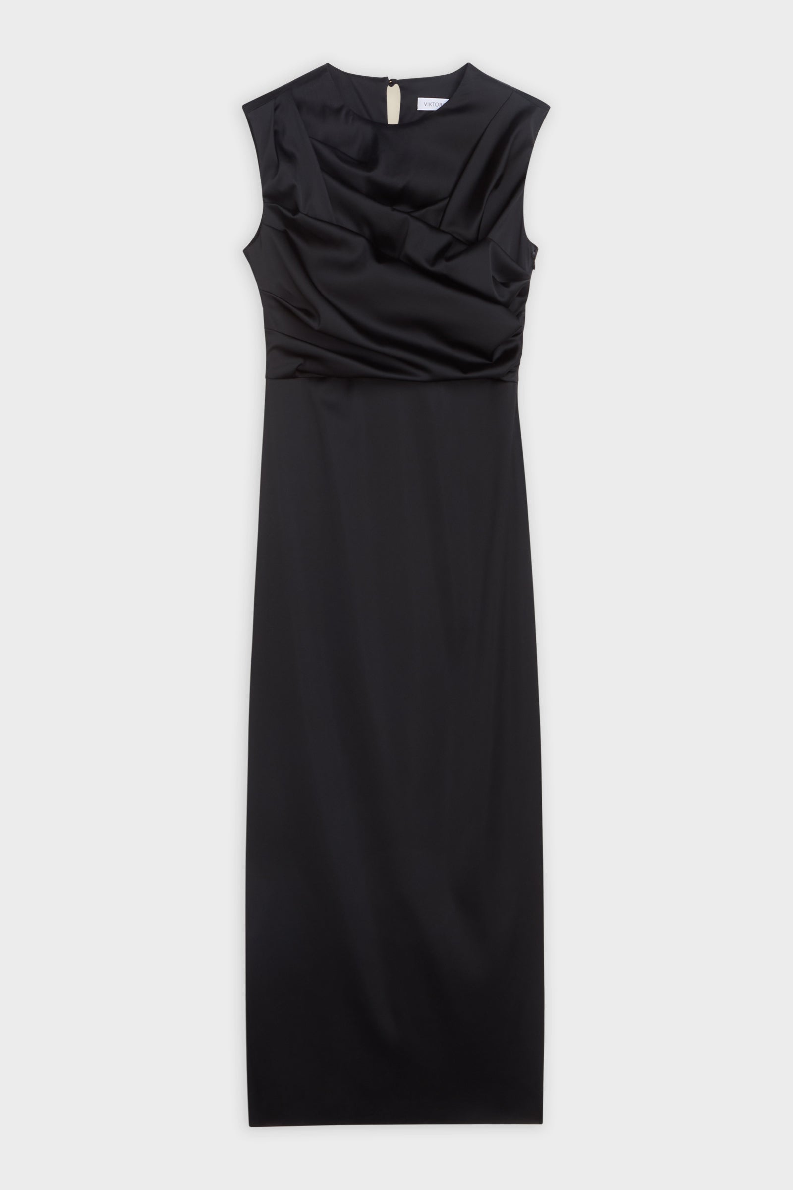 The meticulously placed pleats and stretch satin define the elegance of the dress, reflecting classic Haute Couture craftsmanship with a modern edge.