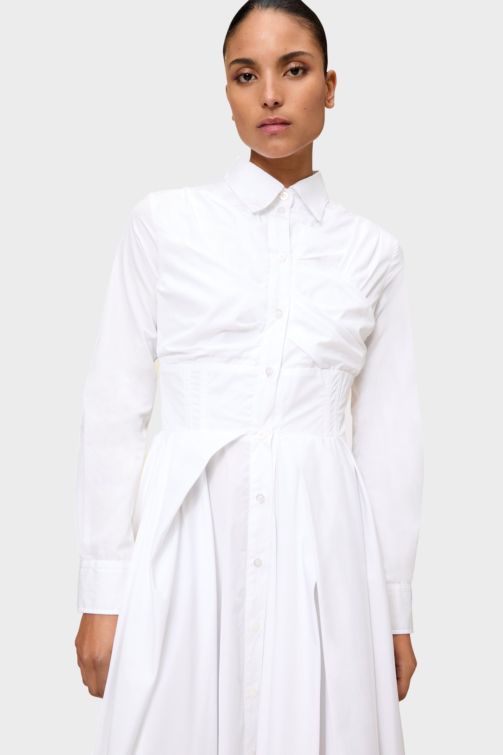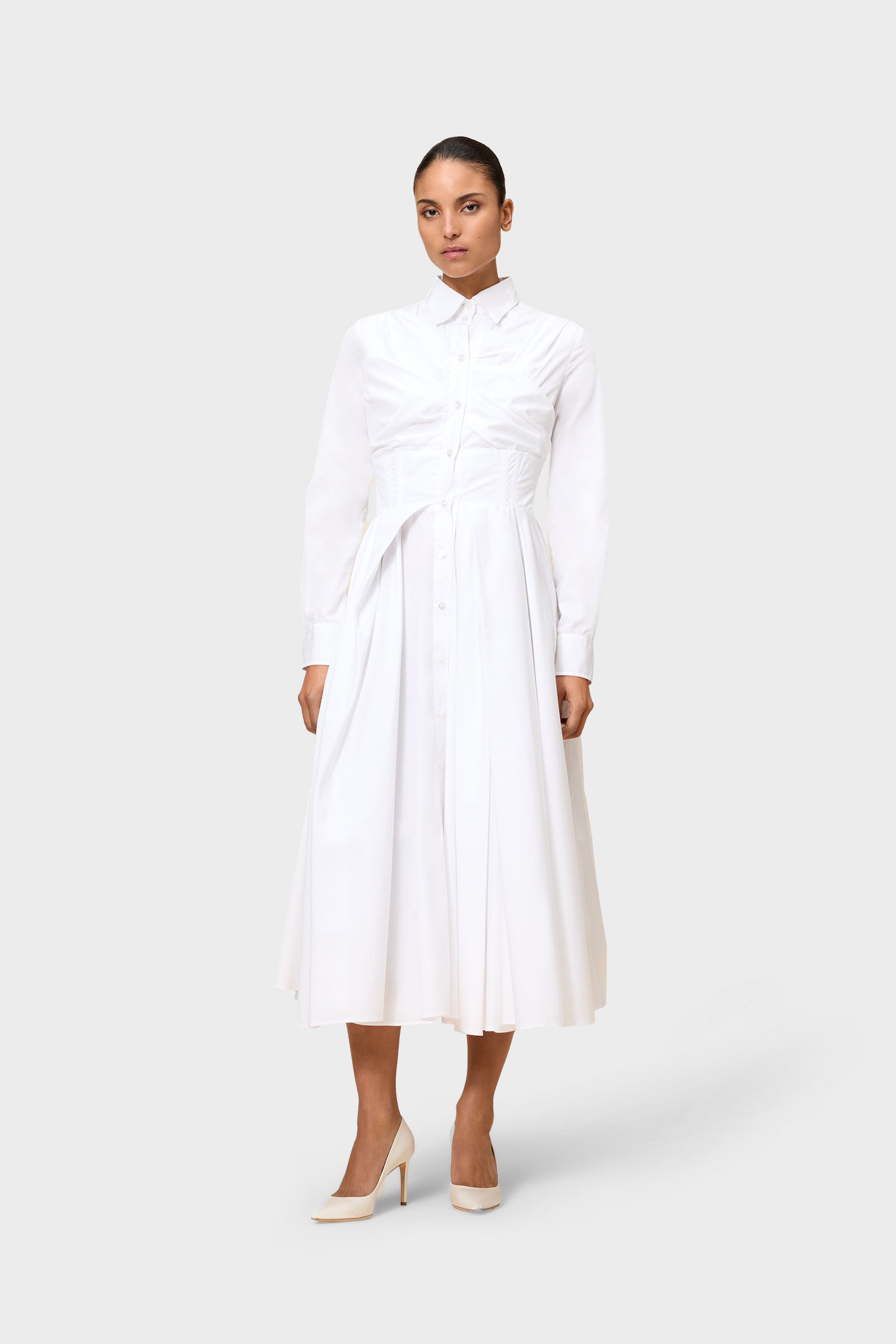 The meticulously placed pleats and poplin define the elegance of the dress, reflecting classic Haute Couture craftsmanship with a modern edge.