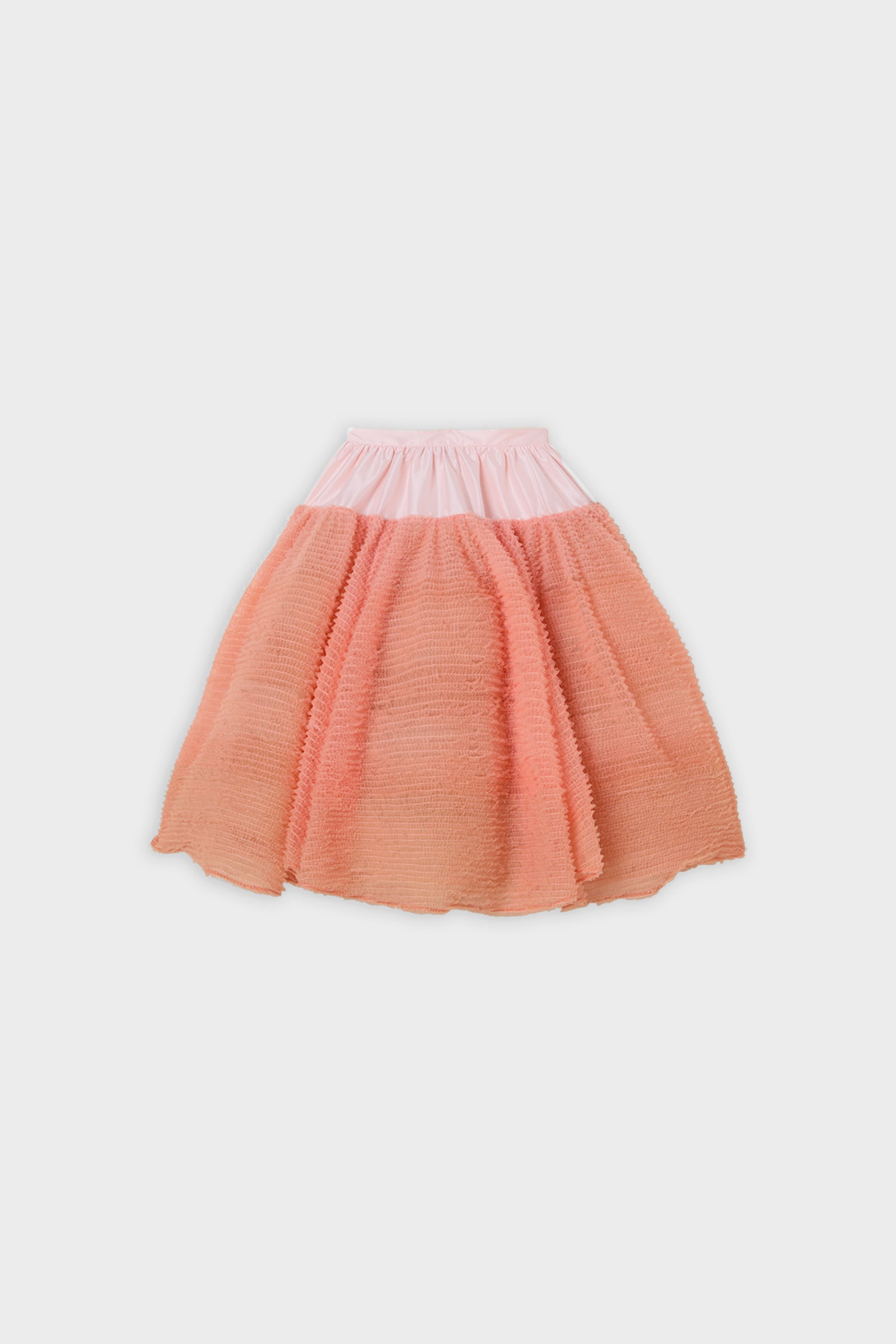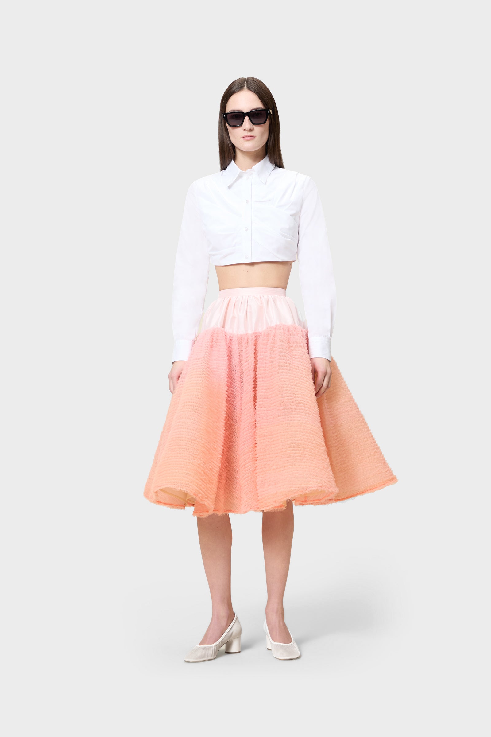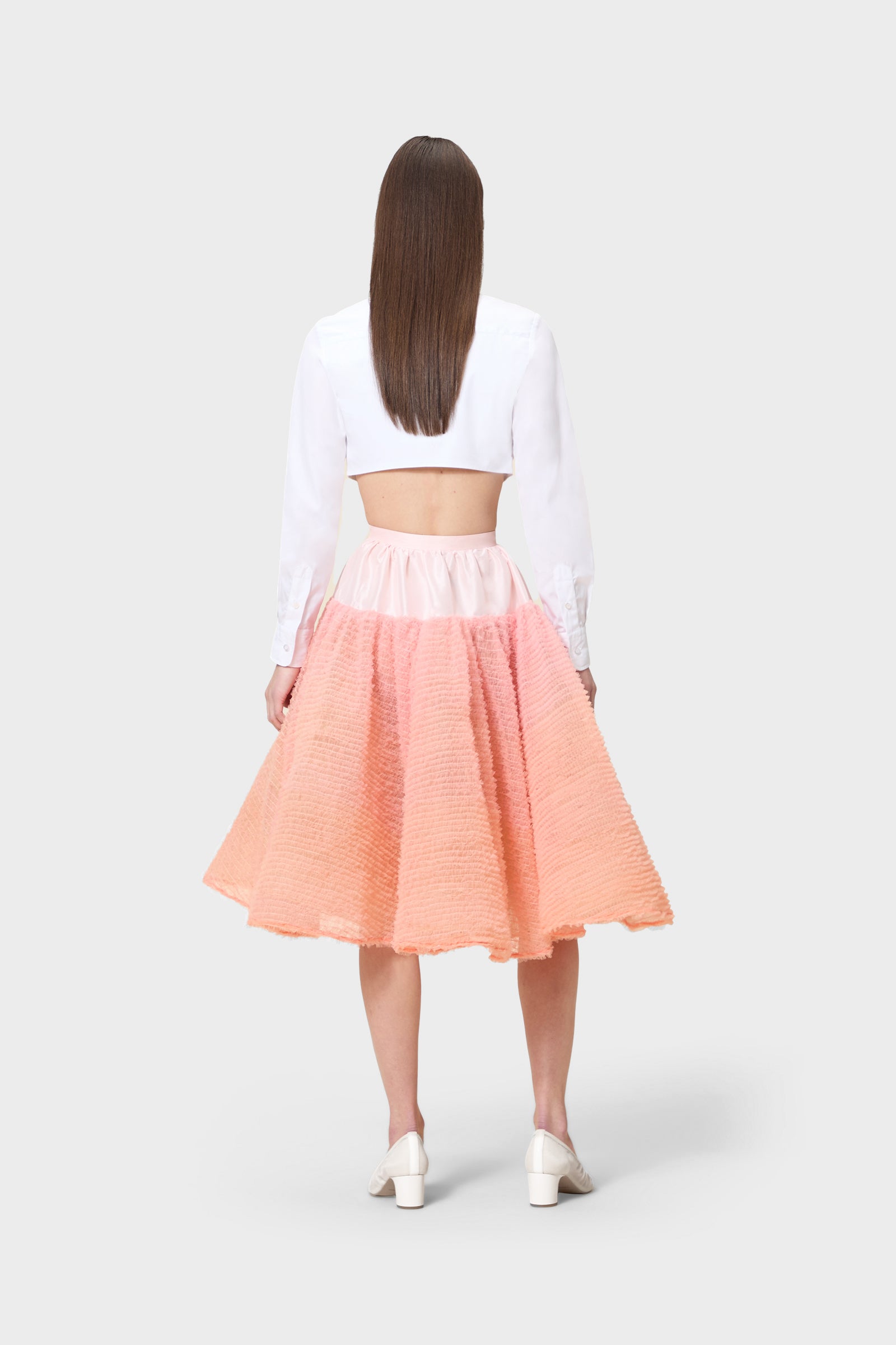 Inspired by the tulle from the ‘Late Stage Capitalism Waltz’ Haute Couture collection, the skirt features hand crafted tulle ruffles for a feminine texture.