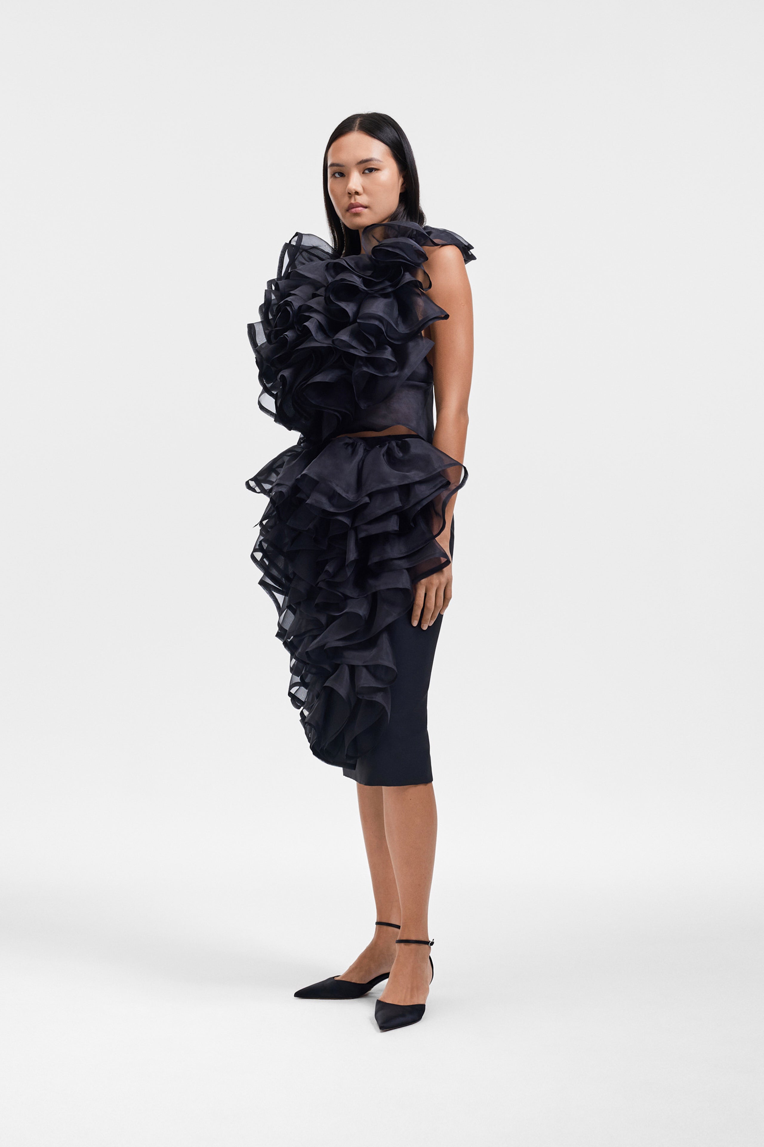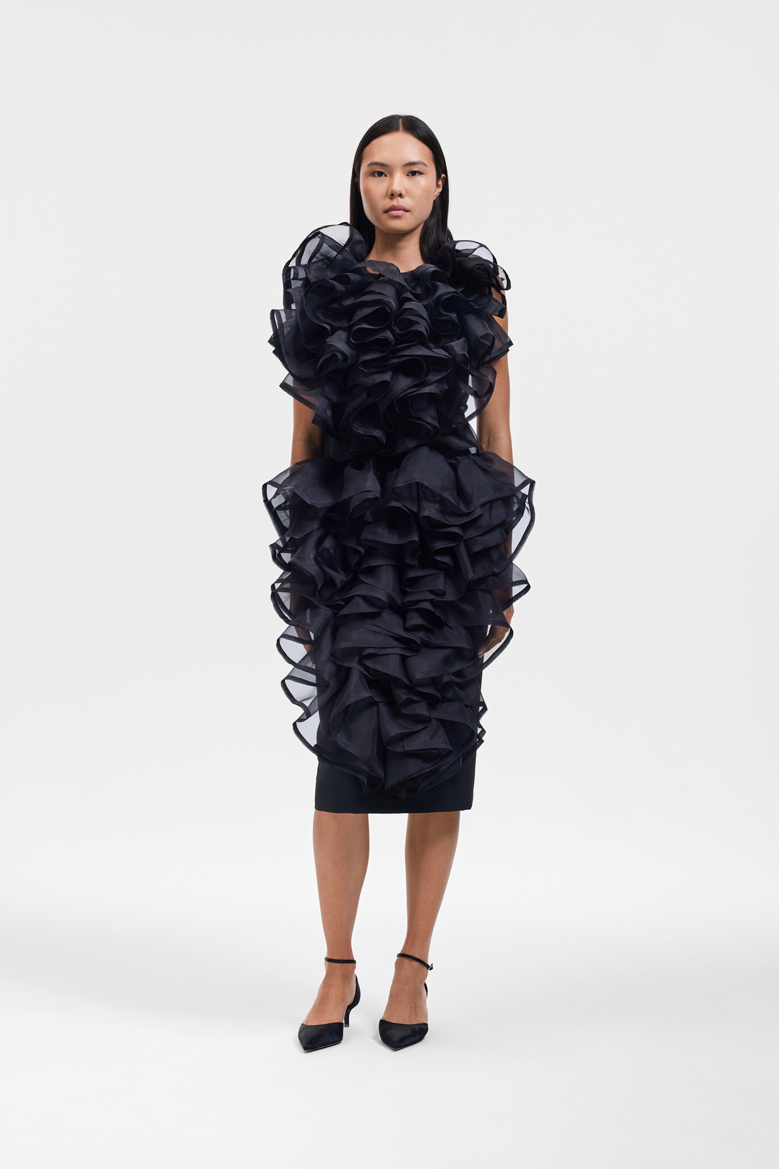 A sculptural pencil skirt combining sleek tailoring with airy organza volants, creating a dramatic textural contrast in classic black.