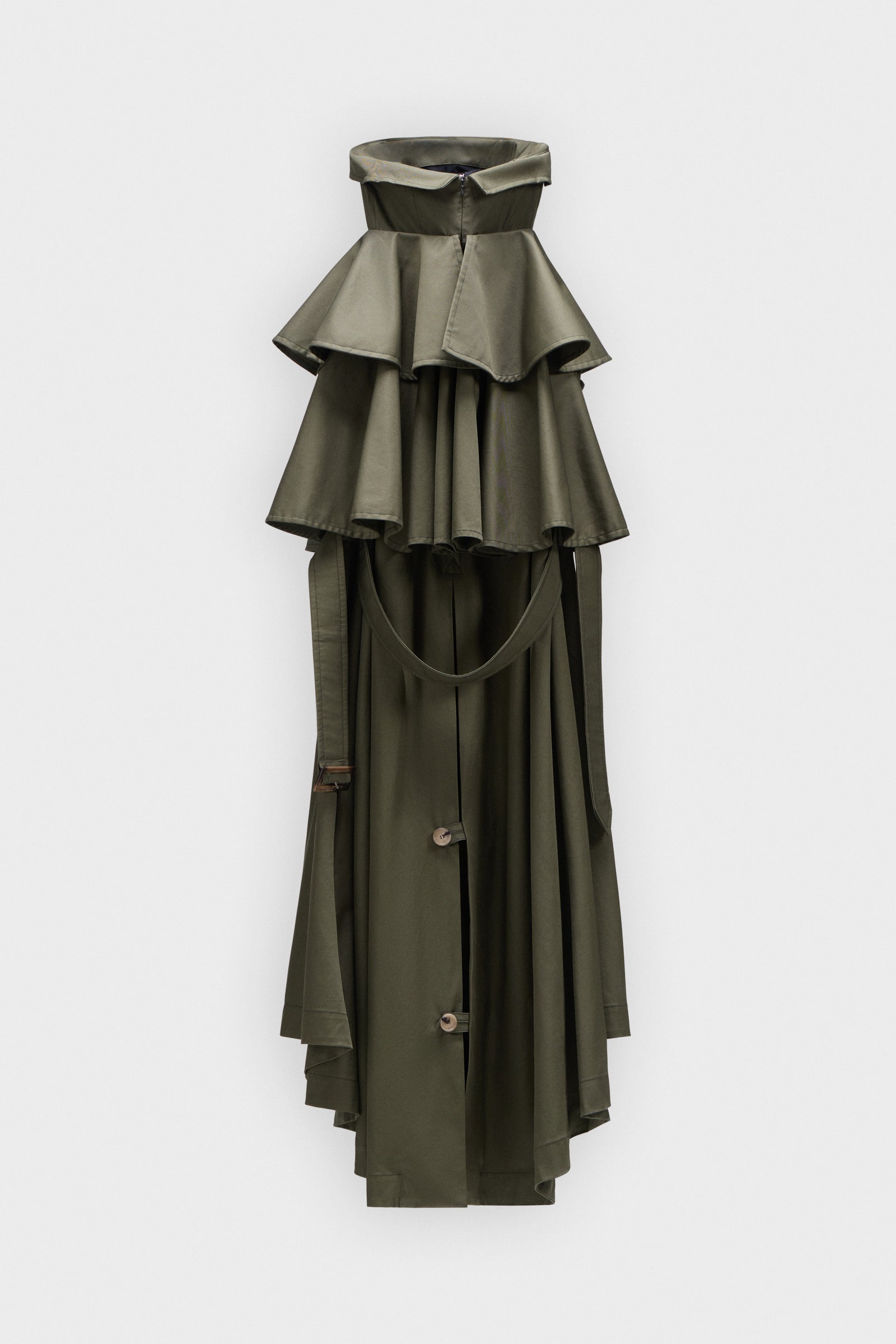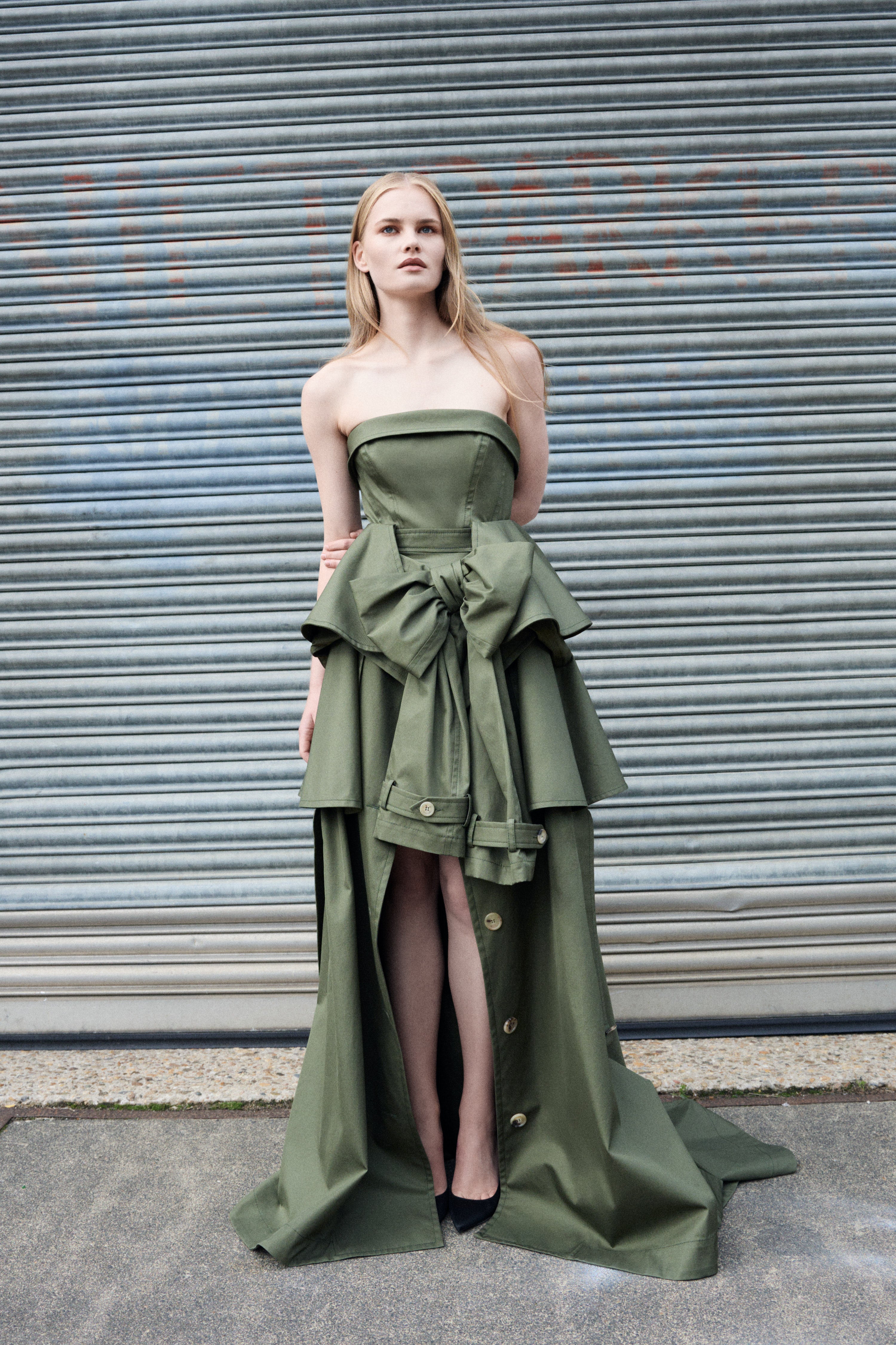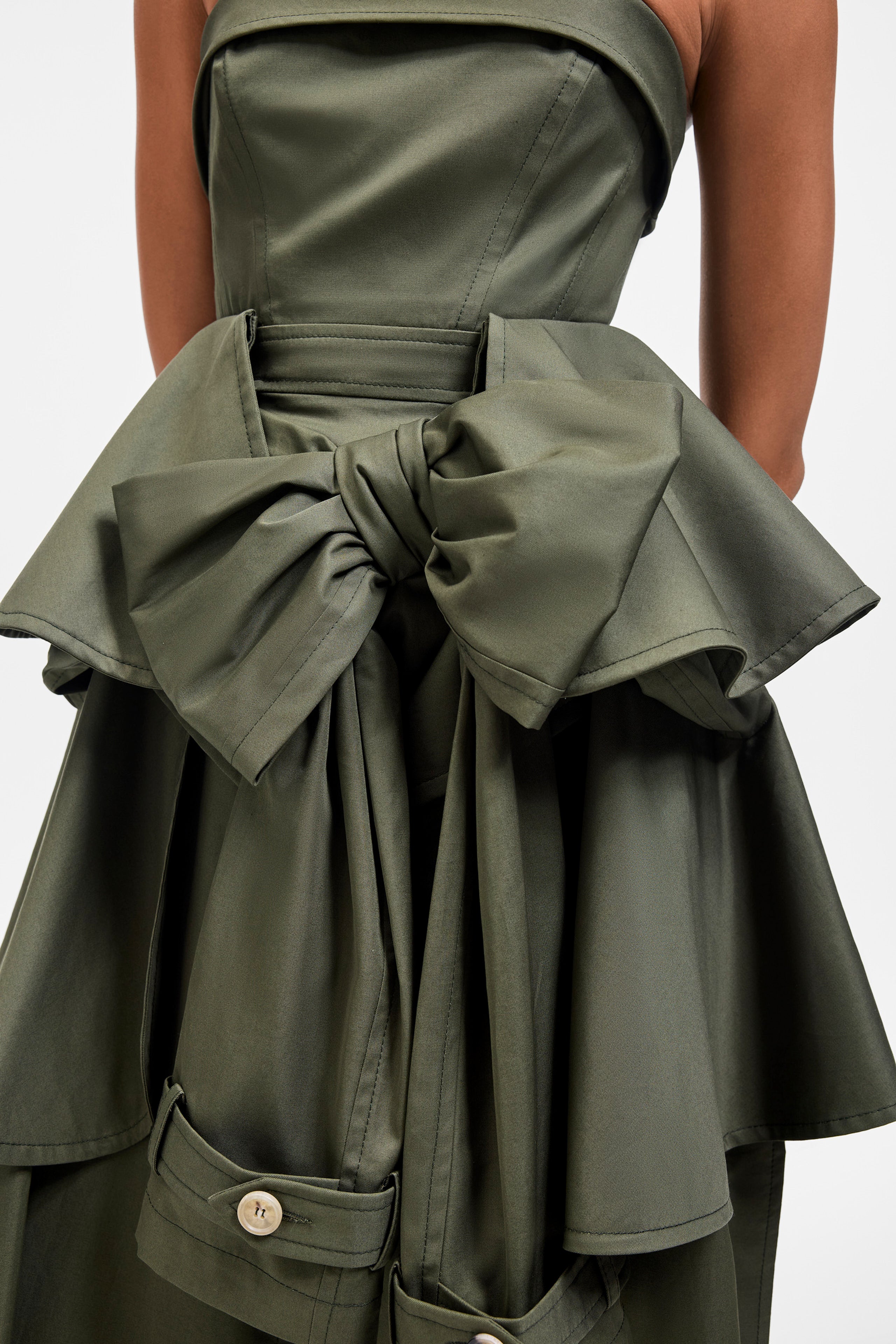 Een getailleerde strapless korsetjurk met een A-lijn gedrapeerde rok, gevormd door het seizoensgebonden dynamische patroon in stevig olijfgroen gabardine.