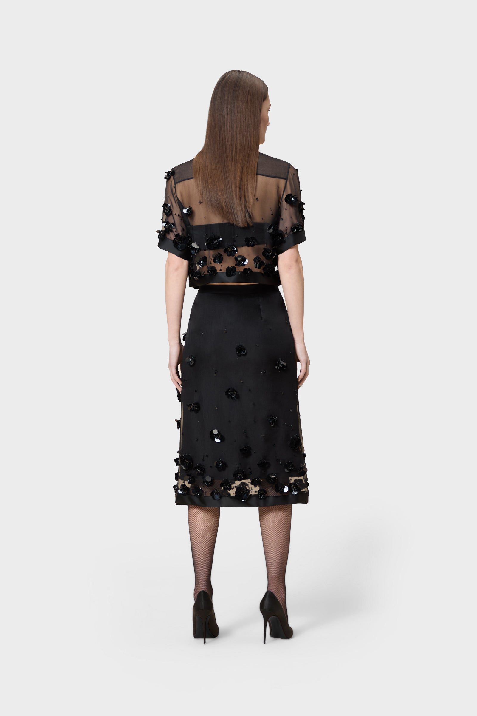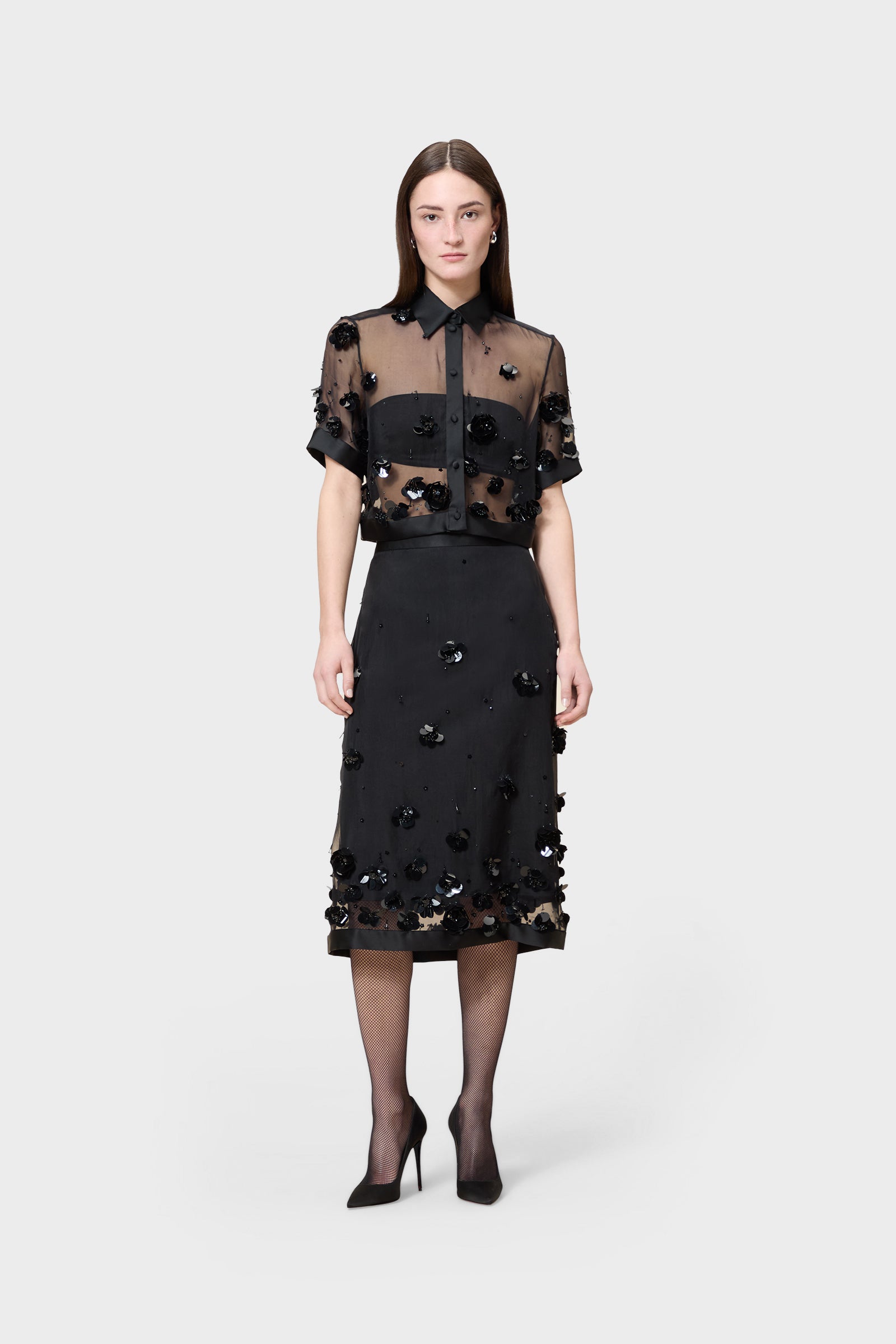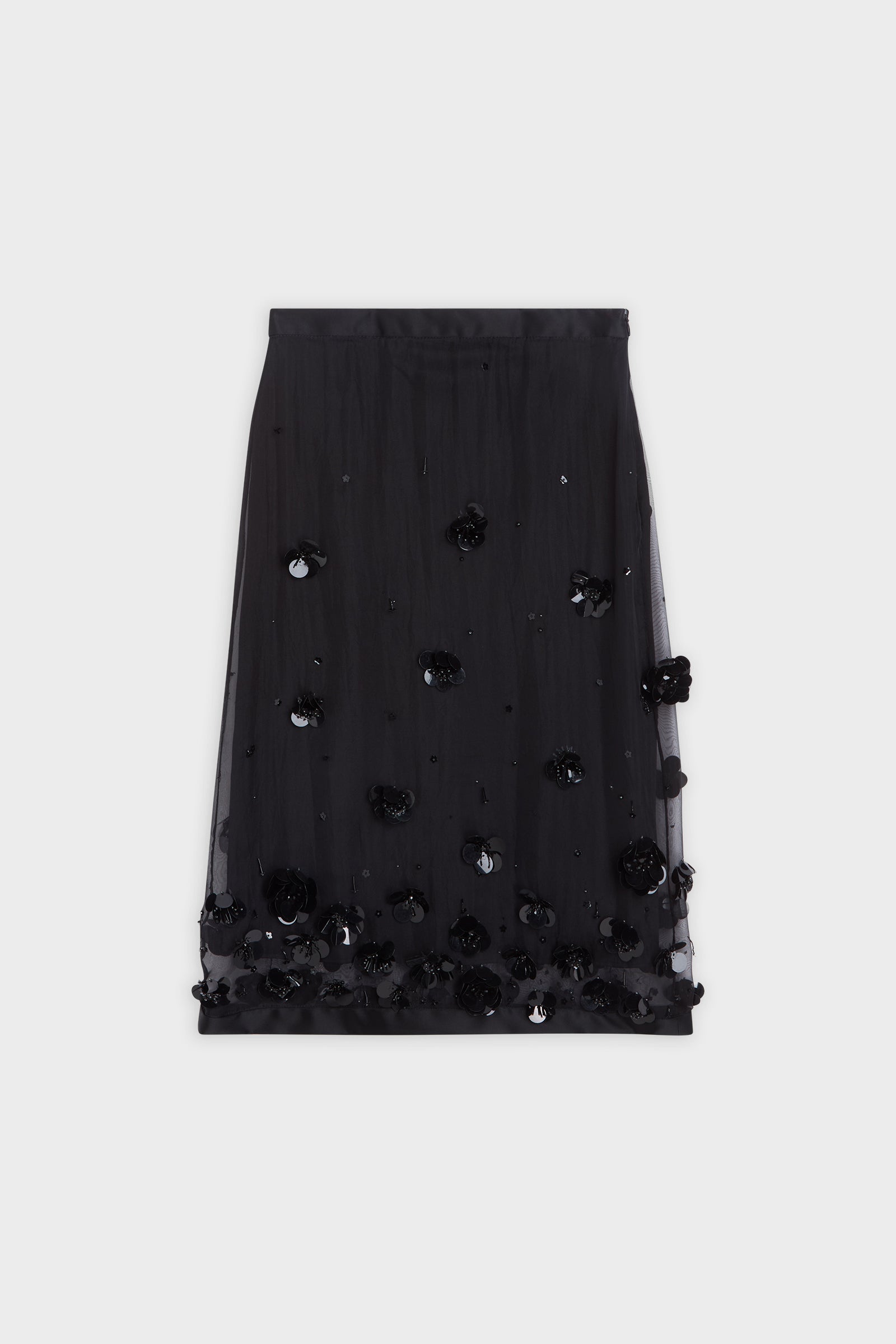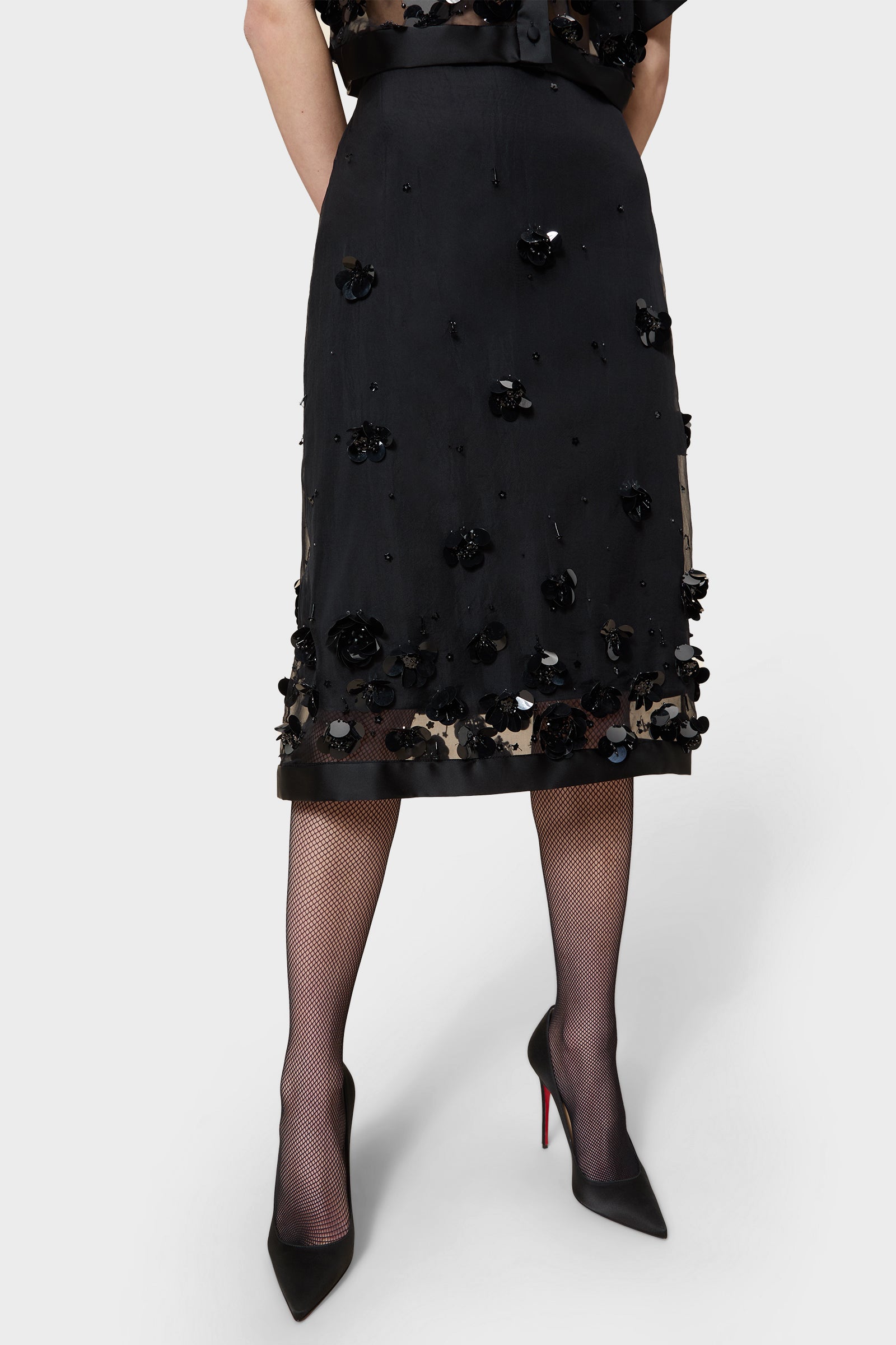 Met de handmatig aangebrachte pailletten en kristallen op zijden organza met satijnen randen, geeft deze rok klassieke bloemenborduursels een moderne look.