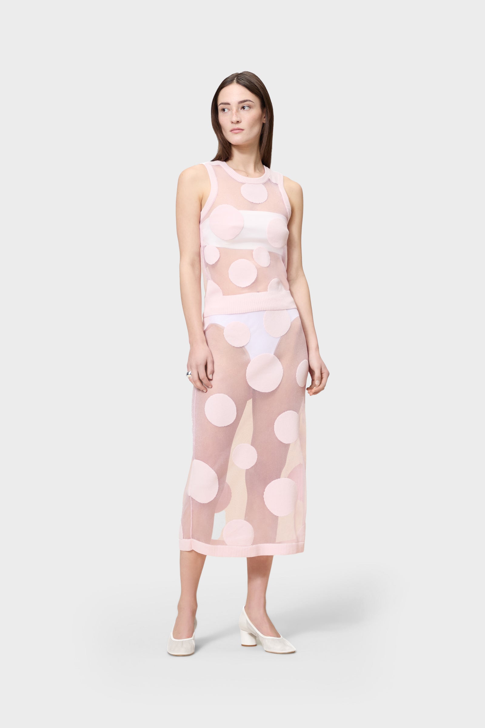 Het klassieke patroon van de rok krijgt een moderne twist met een complex polkadot gaatjesontwerp op gebreide jacquard.