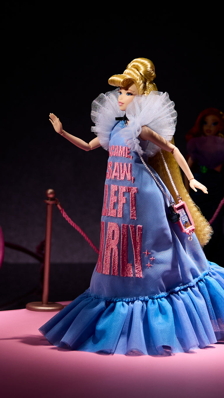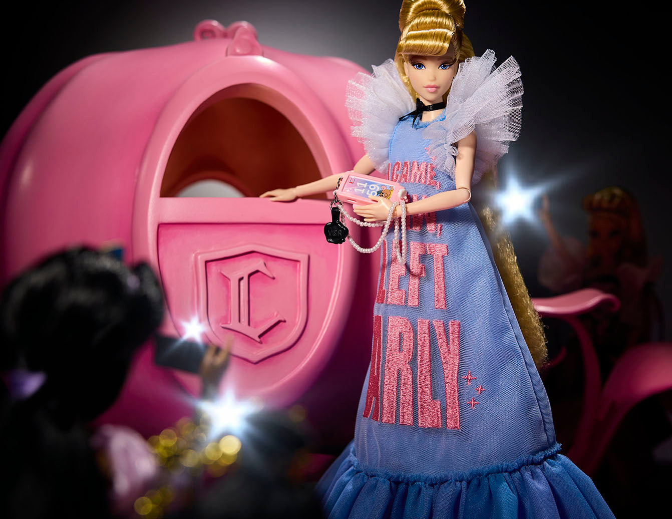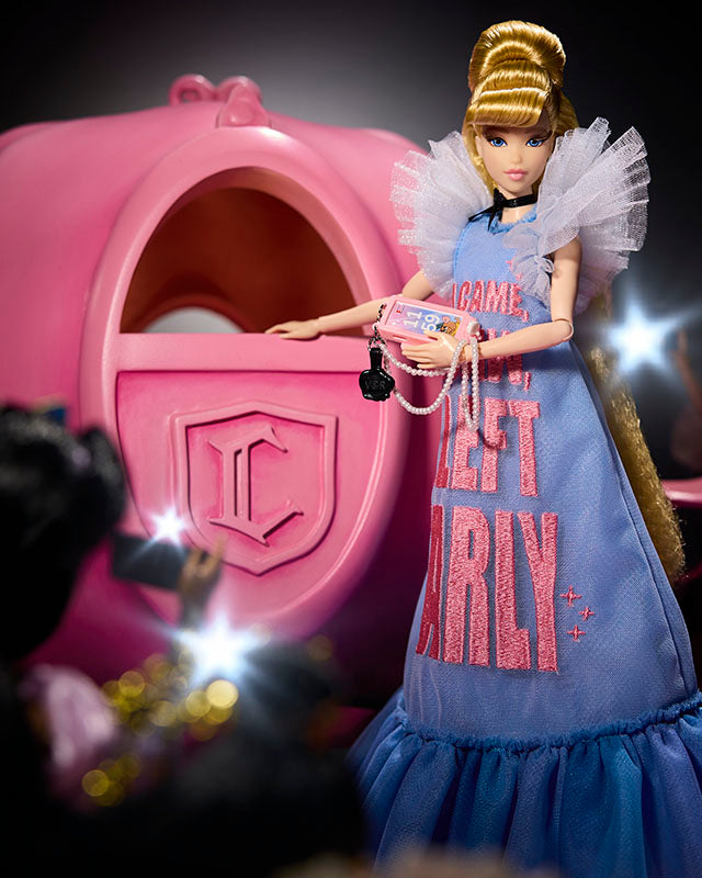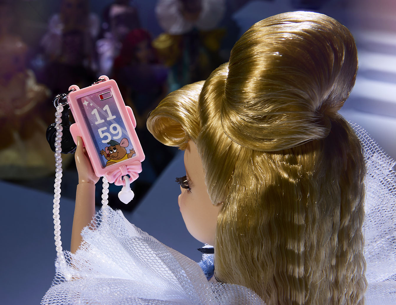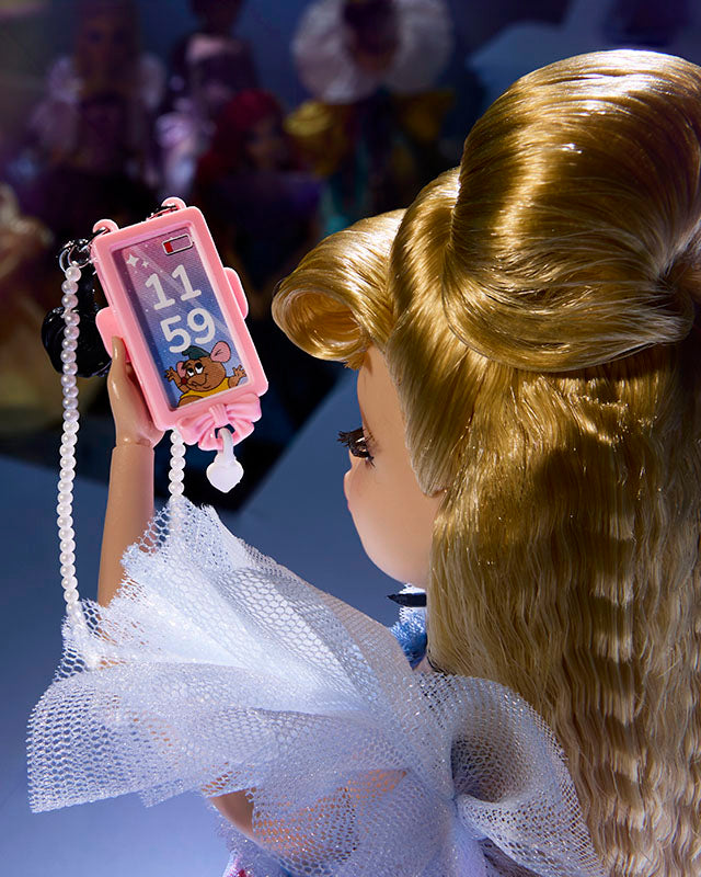 Dressed to dazzle, this dreamer comes with all the modern princess essentials, including a smartphone frozen at 11:59, sparkling slippers, a molded pillow to hold them, and a custom doll stand.