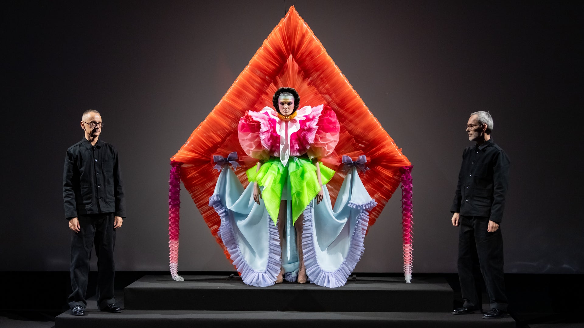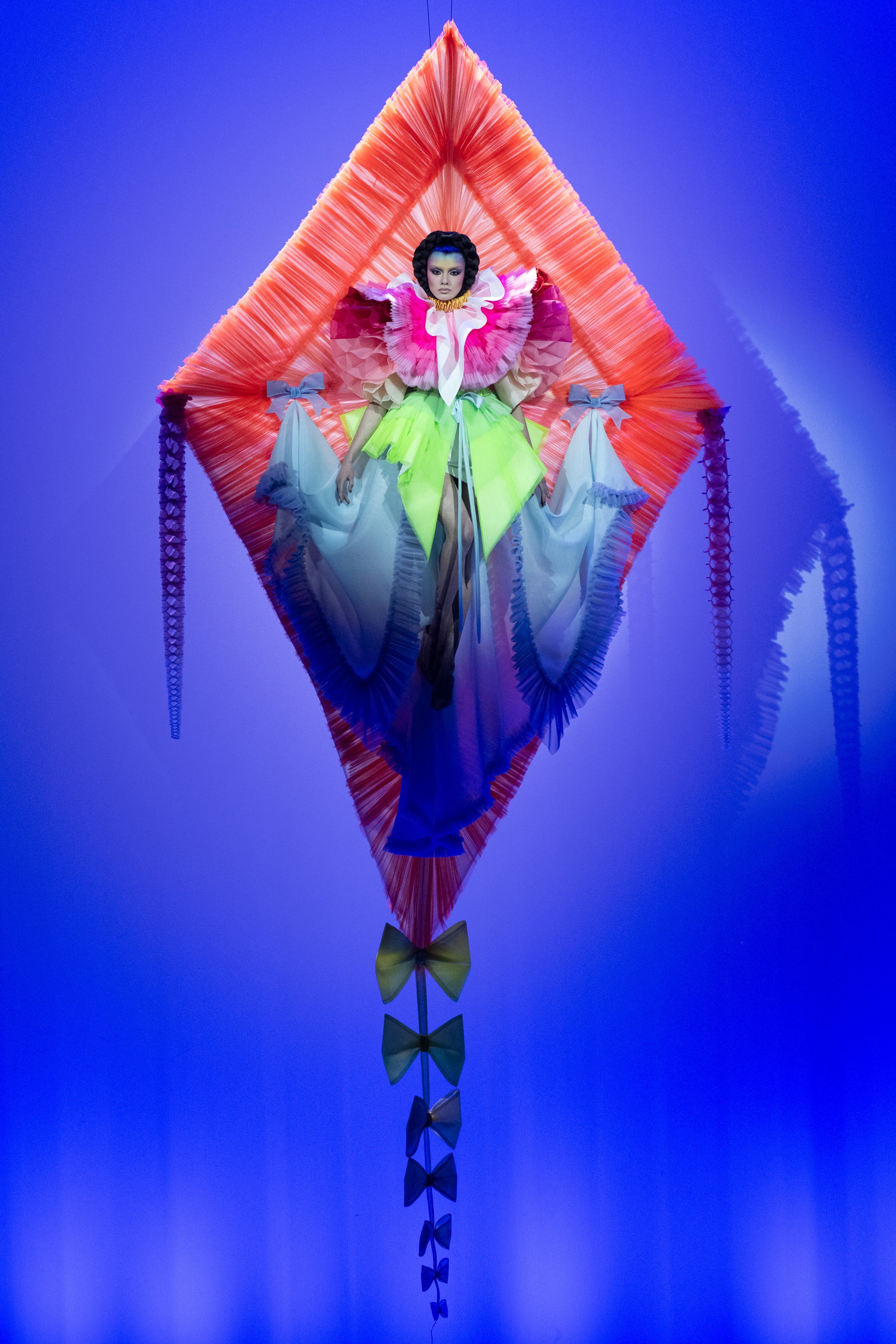 The collection culminates in a breathtaking “kite” finale – a tribute to the iconic Kate Bush album cover that has inspired the designers since the very beginning. The final look appears suspended between earth and sky, a jubilant embodiment of aspiration and grounding, flight and stillness.