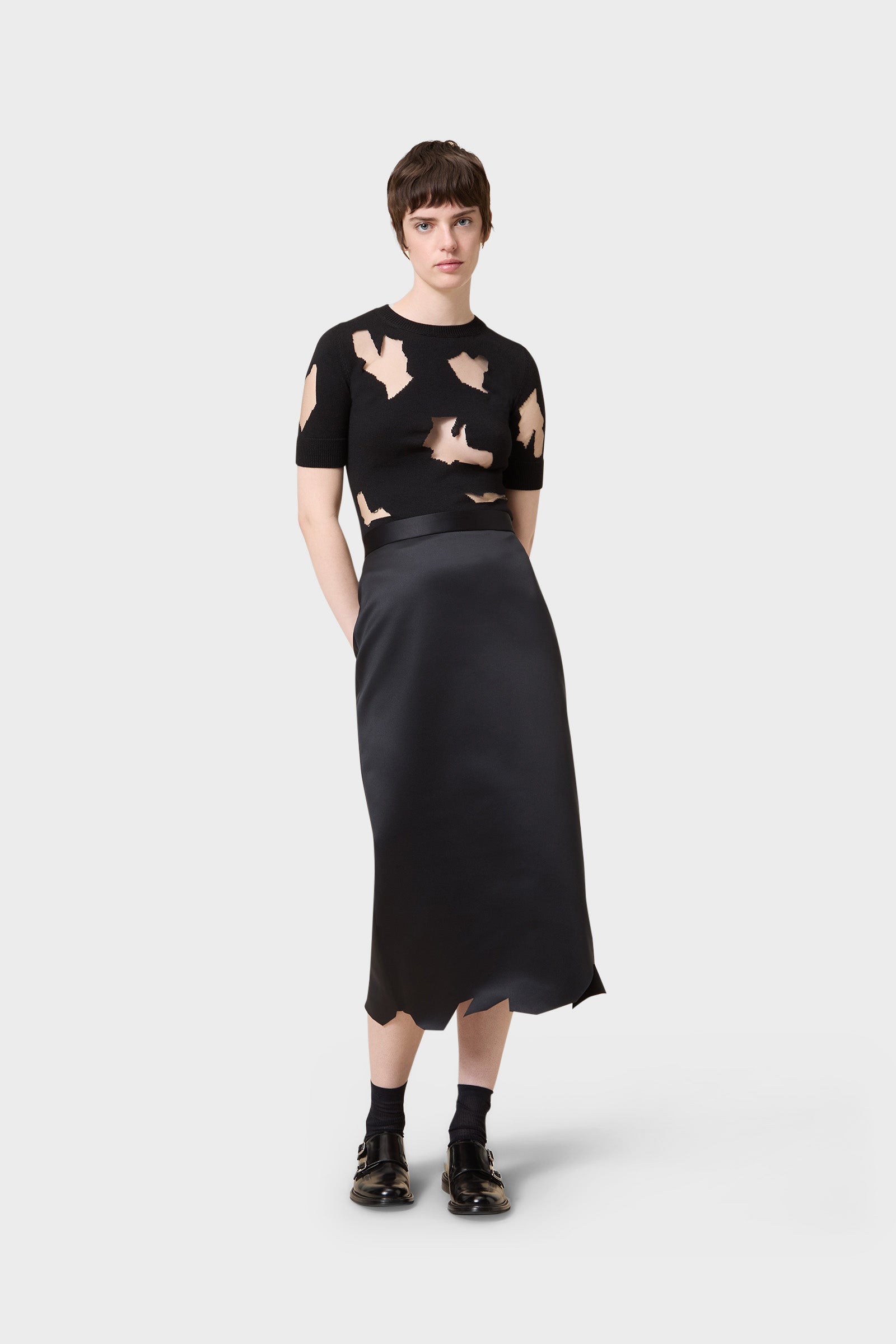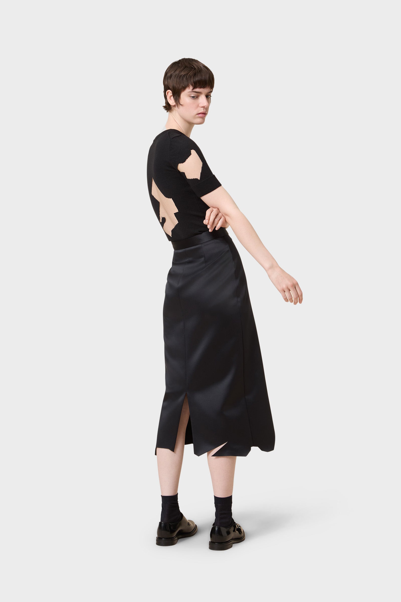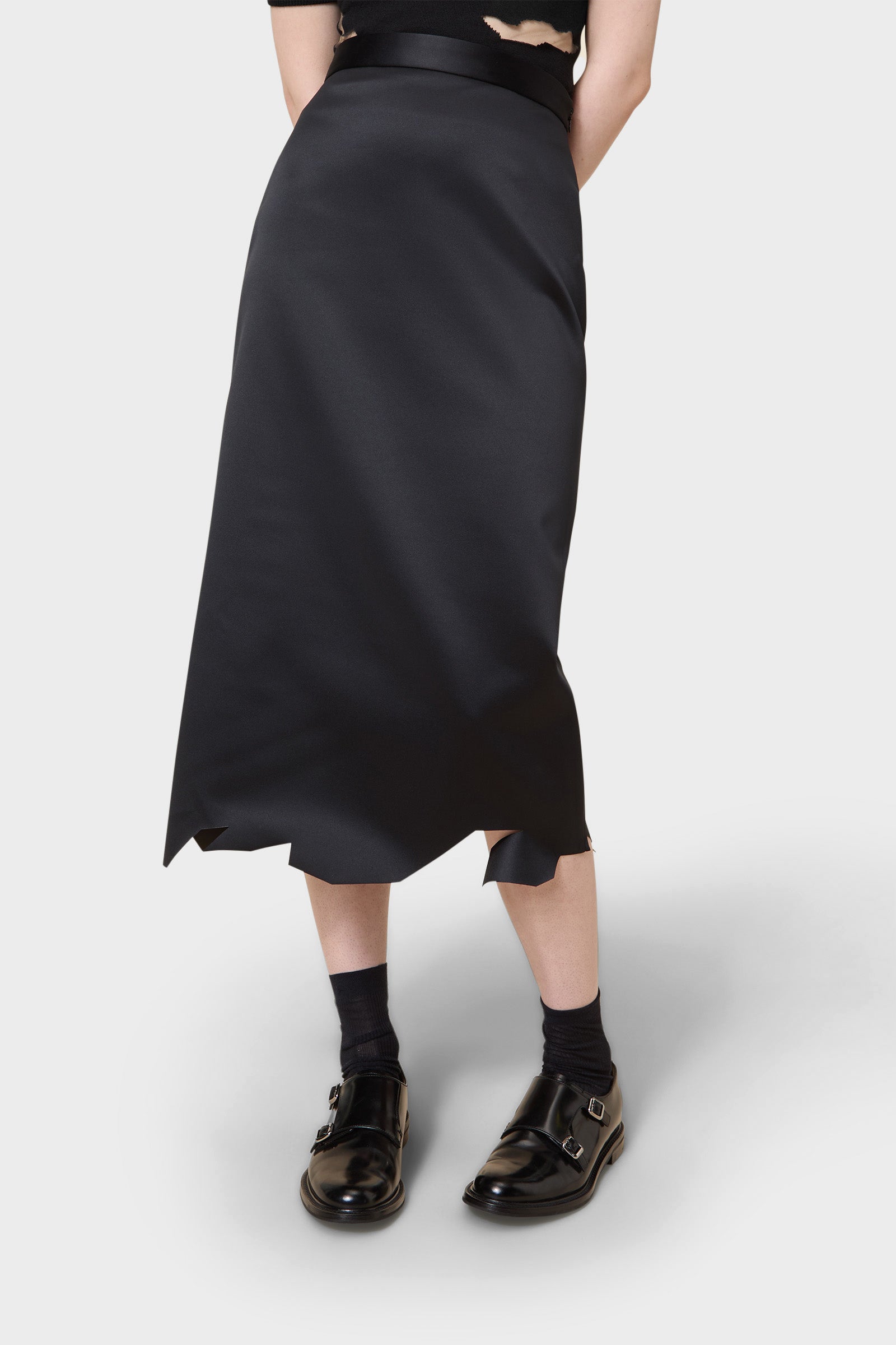 Continuing the story told with Viktor&Rolf Scissorhands, the pencil skirt in Japanese bonded satin with the cut detailed hem showcases an interplay between tradition and innovation.