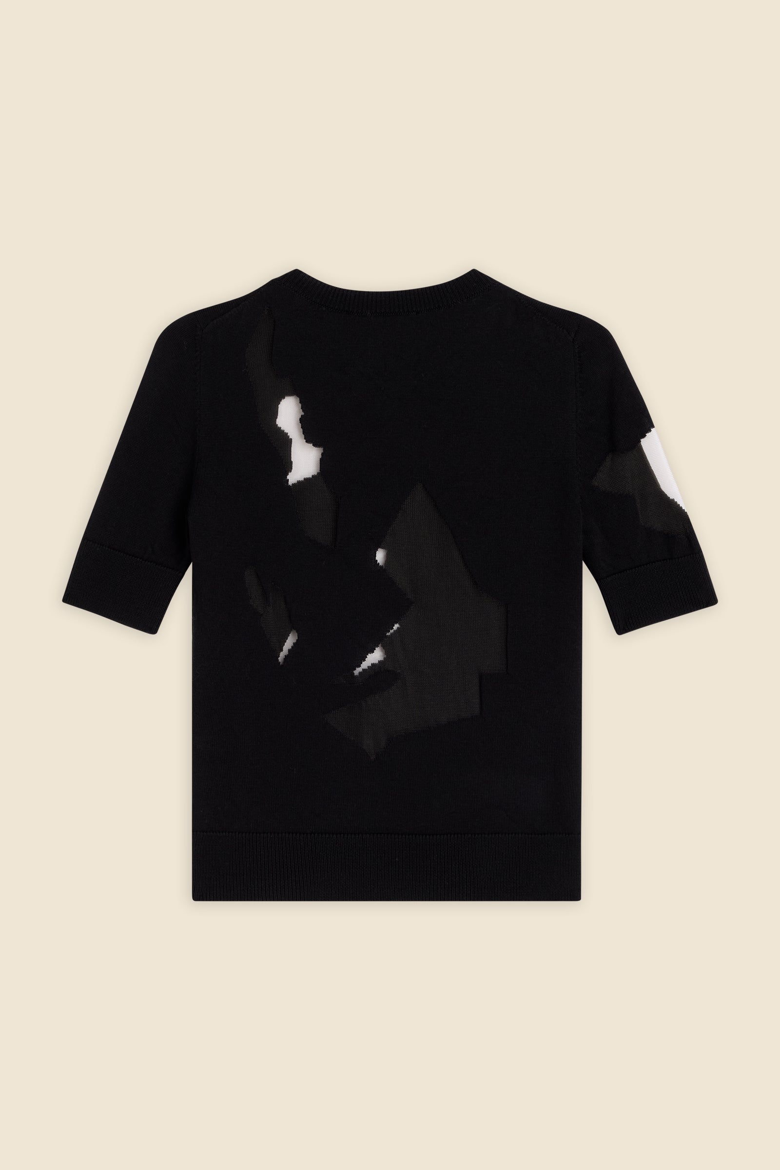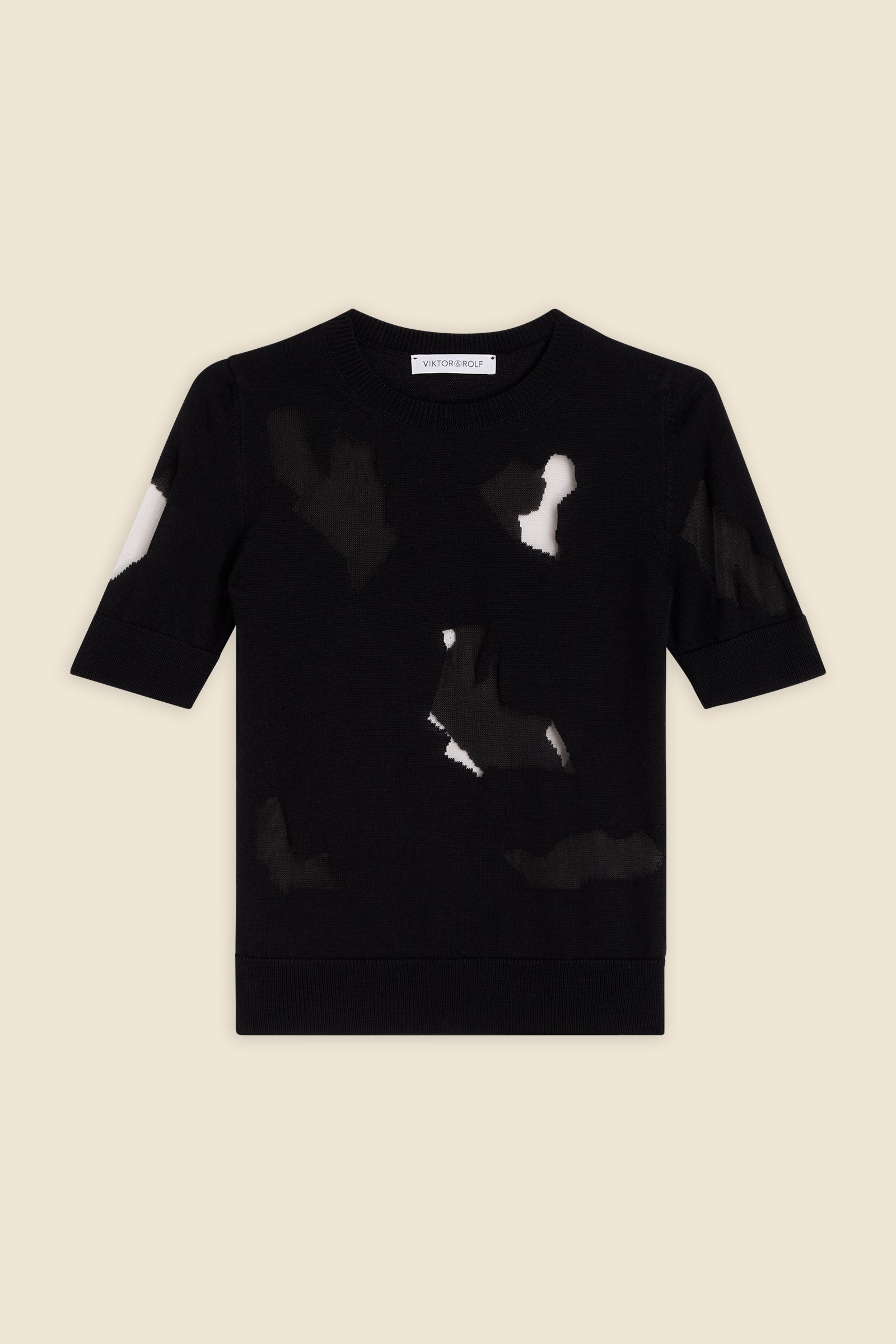 The knitwear, inspired by Viktor&Rolf's Scissorhands, is crafted with 100% merino wool and showcases intricate holes knitted with transparent yarn in a jacquard technique.