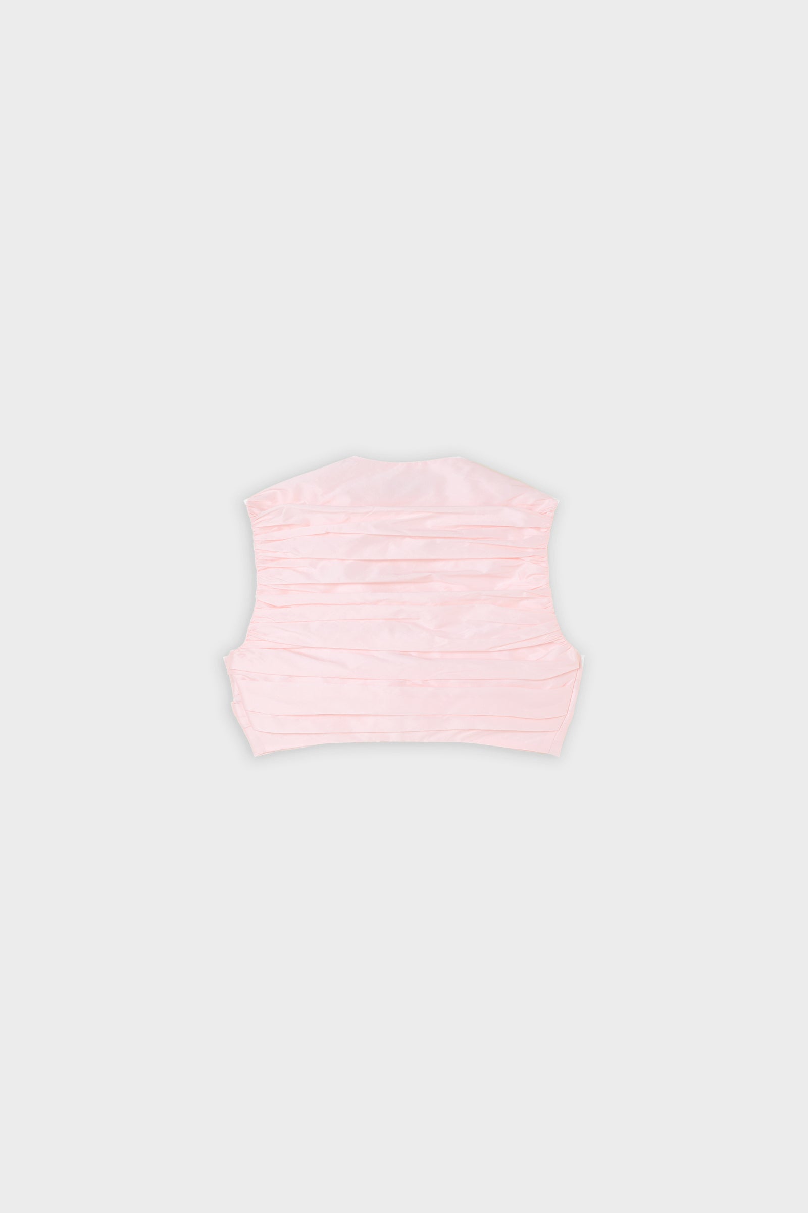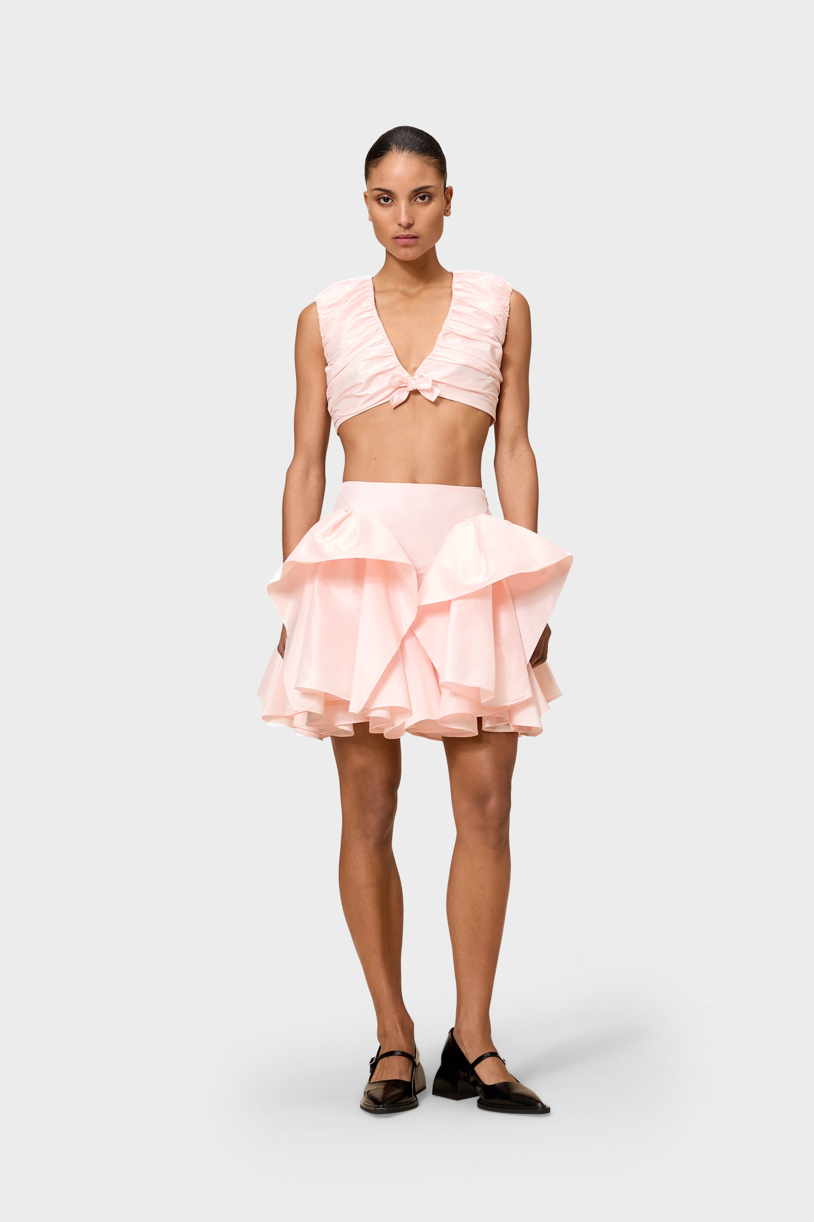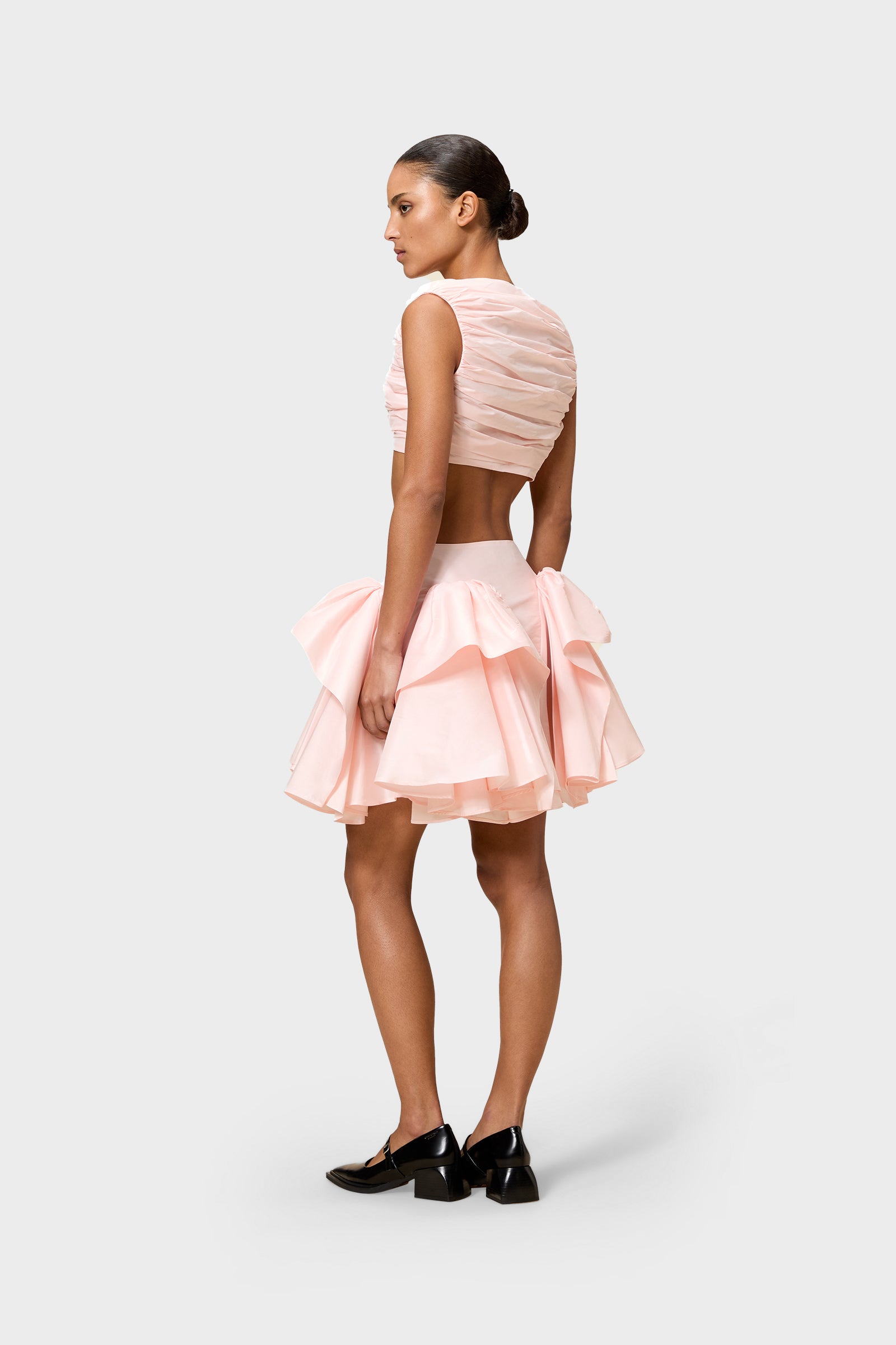 The meticulously placed pleats and silk-blend taffeta define the elegance of the top, reflecting classic Haute Couture craftsmanship with a modern edge.