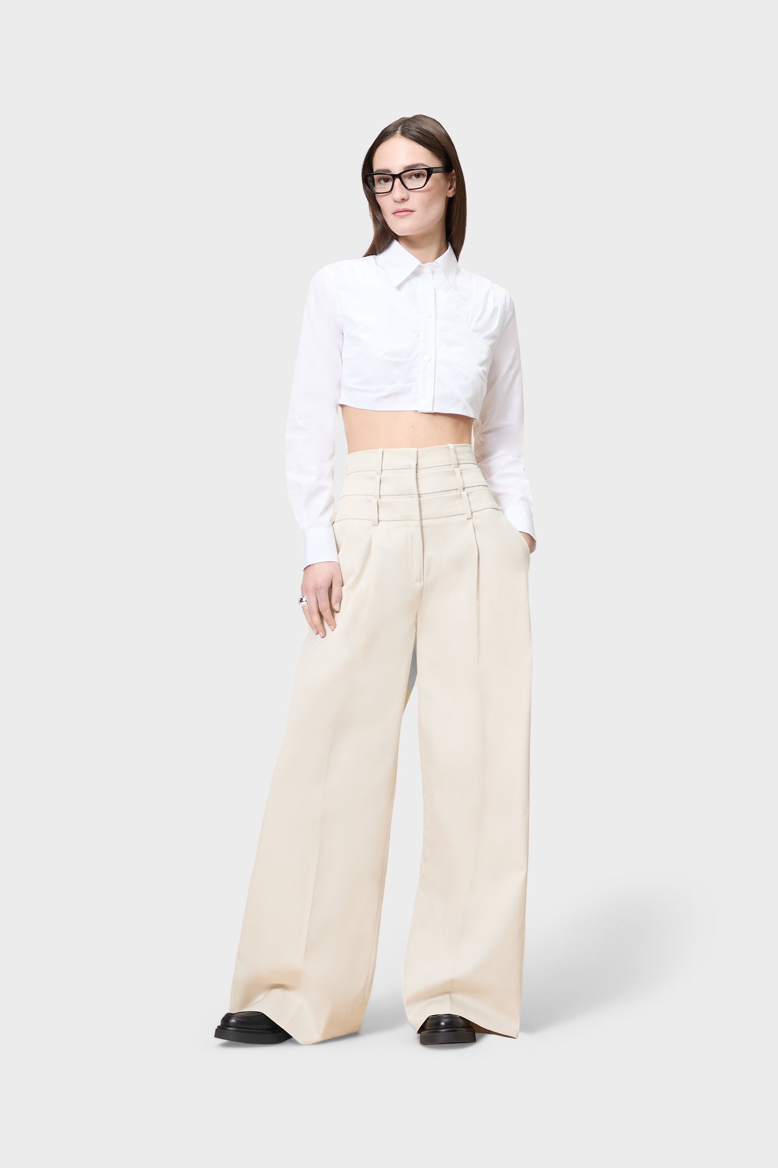 The meticulously placed pleats and poplin define the elegance of the shirt, reflecting classic Haute Couture craftsmanship with a modern edge.
