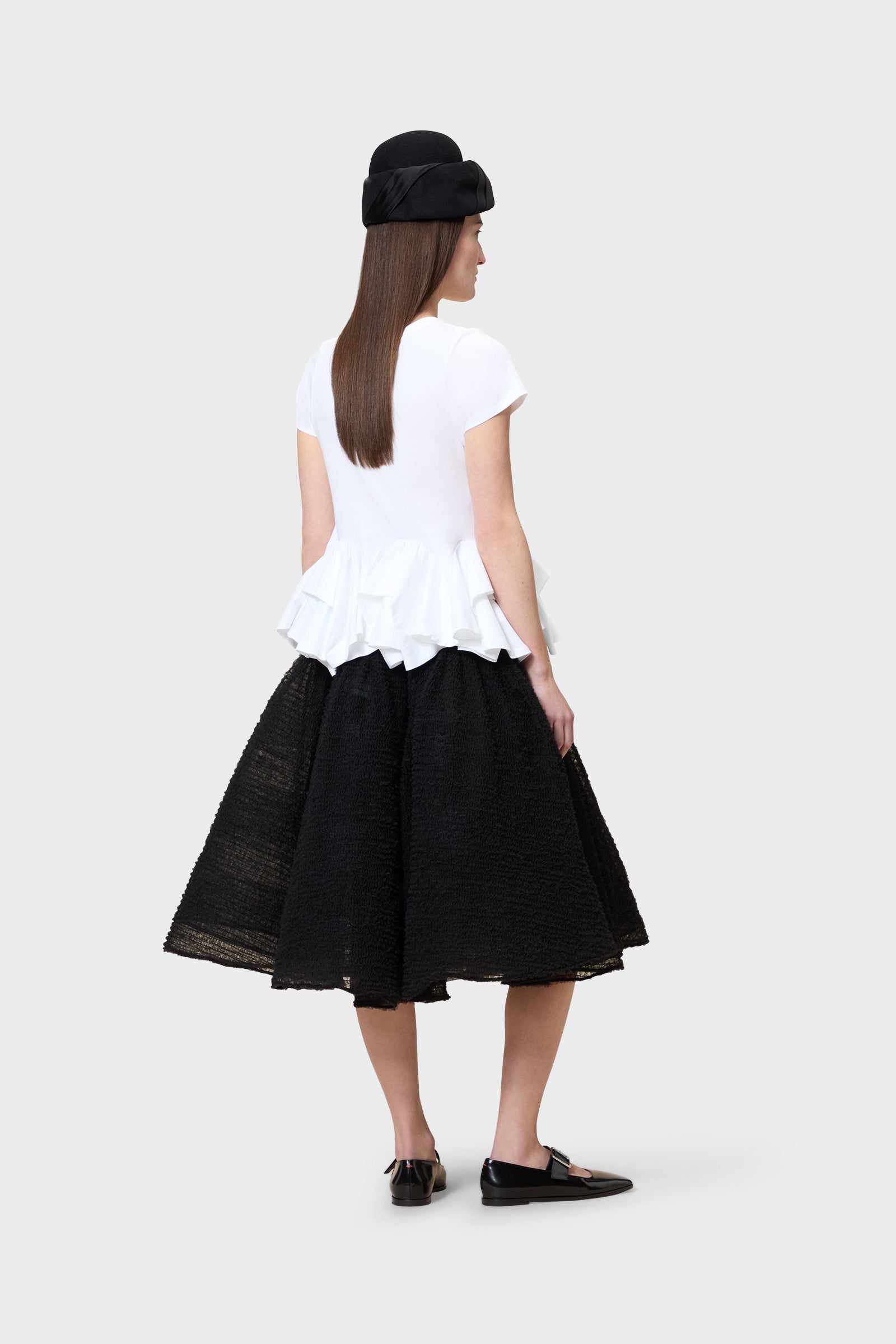 The craftmanship of the top reinterprets classic Haute Couture tuck ups into a modern silhouette.