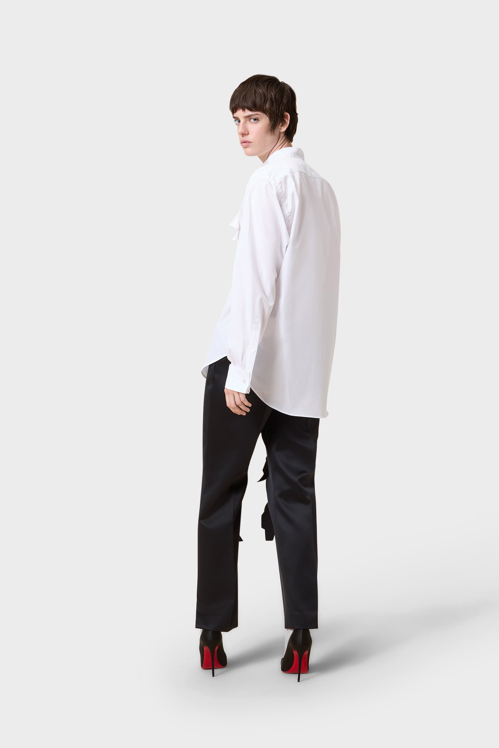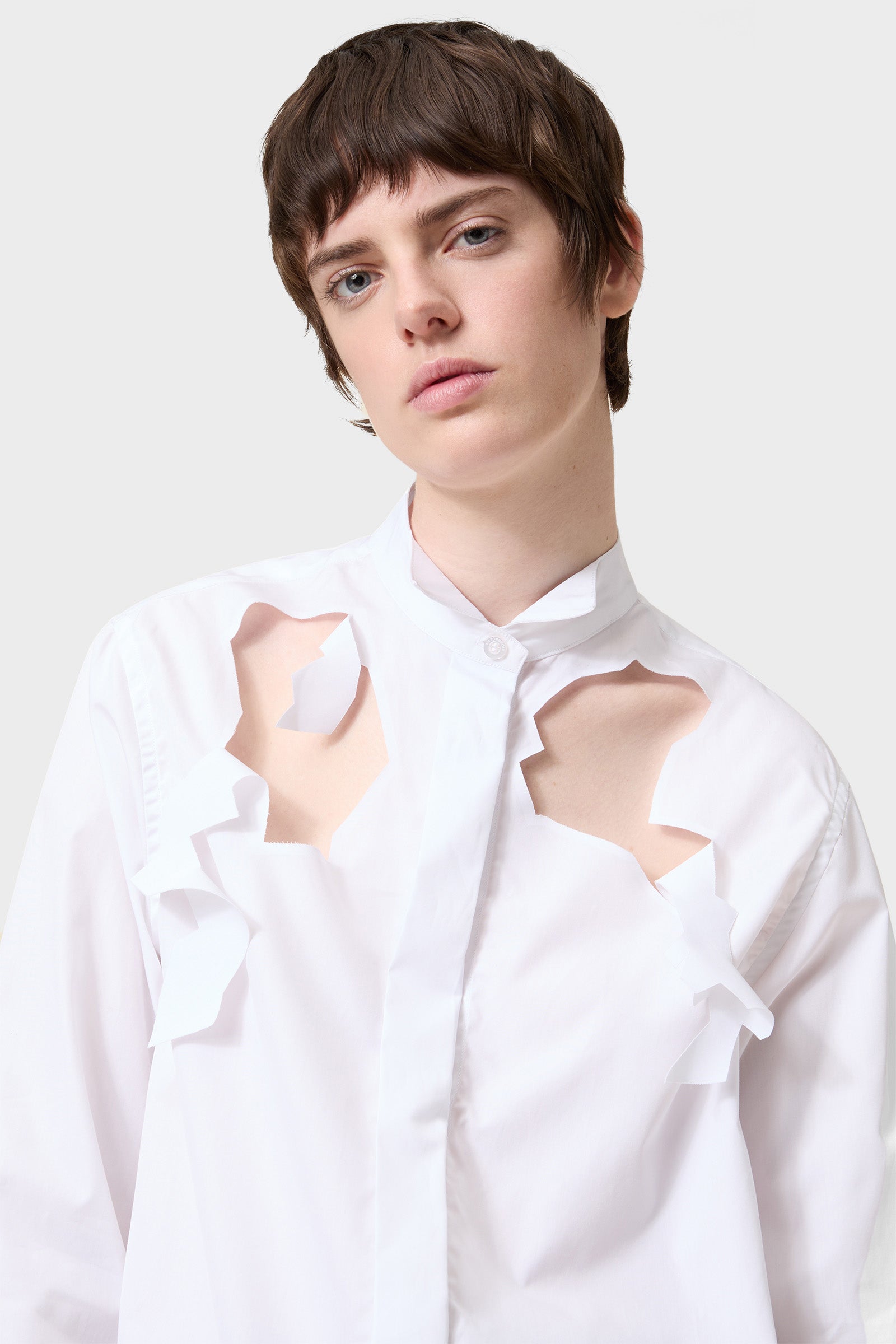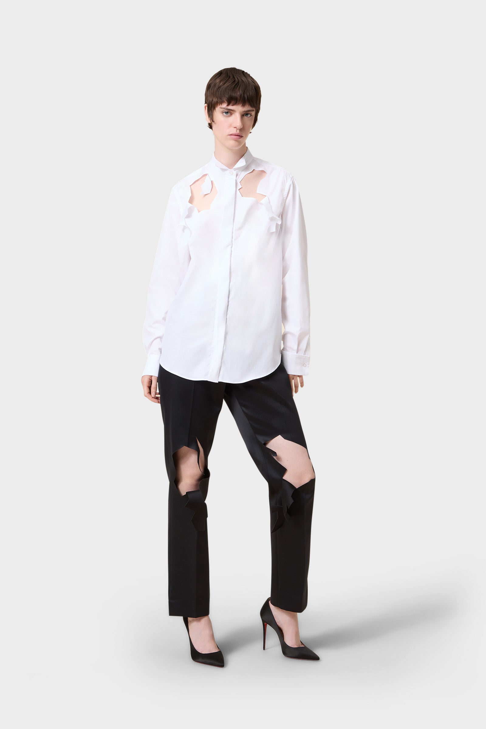 The hand-cut poplin adds a truly artisanal touch to the tuxedo shirt, continuing the story told in Viktor&Rolf Scissorhands.